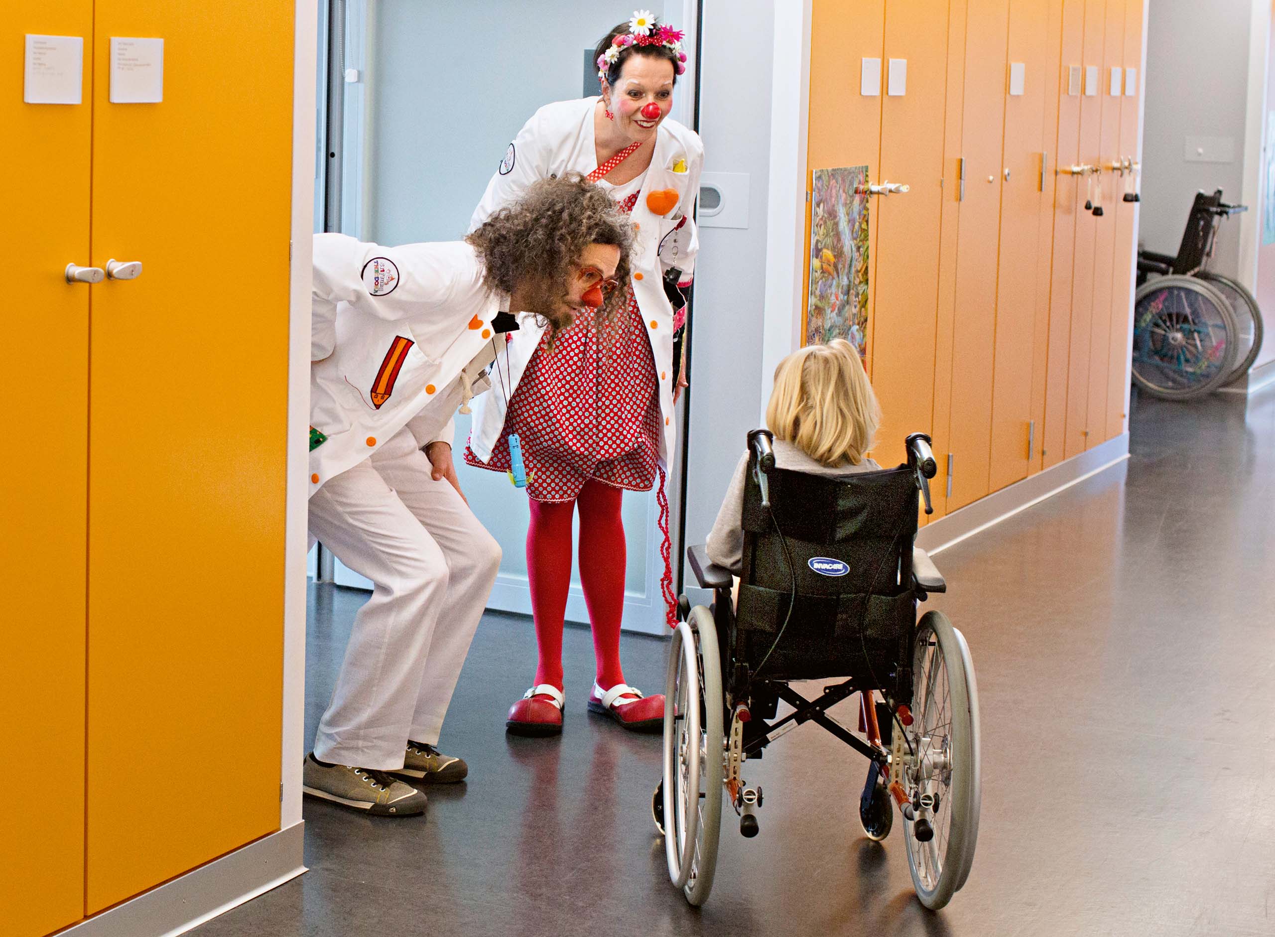 Kinder im Spital sollten sich im Idealfall verhalten wie Erwachsene. Sie sollen vernünftig und tapfer sein und verstehen, dass dies oder jenes sein muss, auch wenn es schmerzt. Sie sind der ganzen Maschinerie ausgeliefert und stehen gewissermassen am unteren Ende der Spitalhierarchie; alle anderen, Ärzte, Schwestern, Eltern, wissen alles besser und wissen, was für sie gut ist. In diese Situation hinein platzt Dr. Trallalla, die sich nicht um Hierarchien kümmert, die nichts weiss und manchmal einfach dumm handelt. Sie verdreht Worte, weiss nicht, wie man eine Tür öffnet, stolpert über ihre eigenen Füsse … Für ein paar Minuten wird die Hierarchie auf den Kopf gestellt, und die Kinder sind für einmal die «Gescheiten», die Traumdiktorin, die den Clowns spielt, die Dumme.