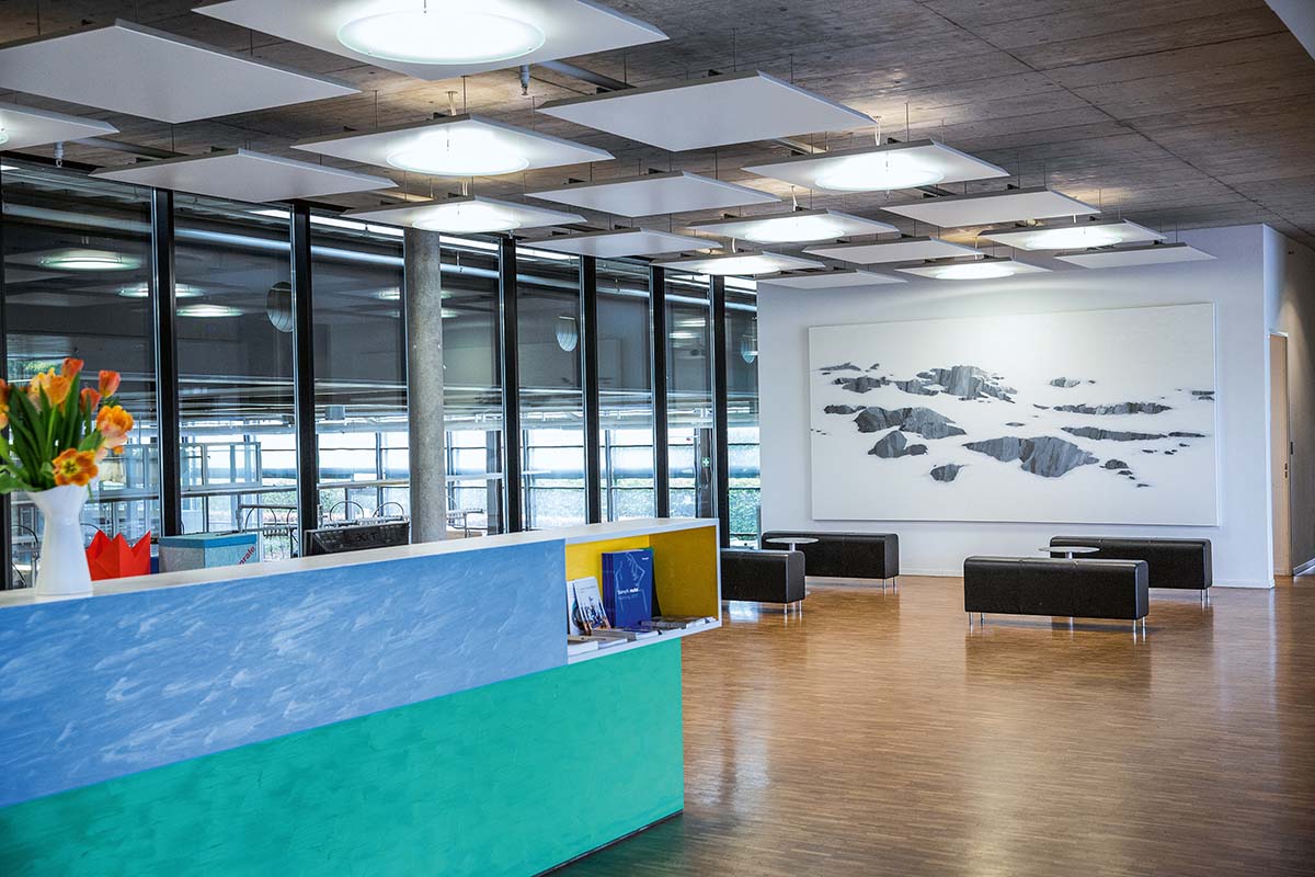 Neben der Ausbildung von jungen Menschen ist bei Stämpfli auch «Kunst und Kultur» ein wichtiges Thema. Unsere Büroräumlichkeiten zeugen von dieser Leidenschaft, an vielen Orten sind Kunstwerke aufgehängt. Im Eingangsbereich an der Wölflistrasse 1 (Hauptsitz in Bern) ist ein besonders grosses und beeindruckendes Kunstwerk zu bewundern. Nämlich ein «Bergbild» des bekannten Schweizer Künstlers Alois Lichtsteiner. Auch der Empfangstresen und die Cafeteria wurden von Alois farblich gestaltet.
