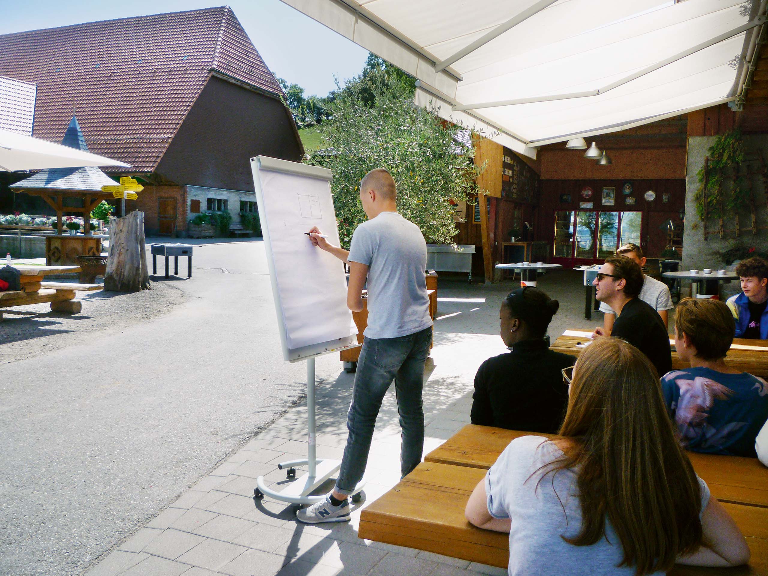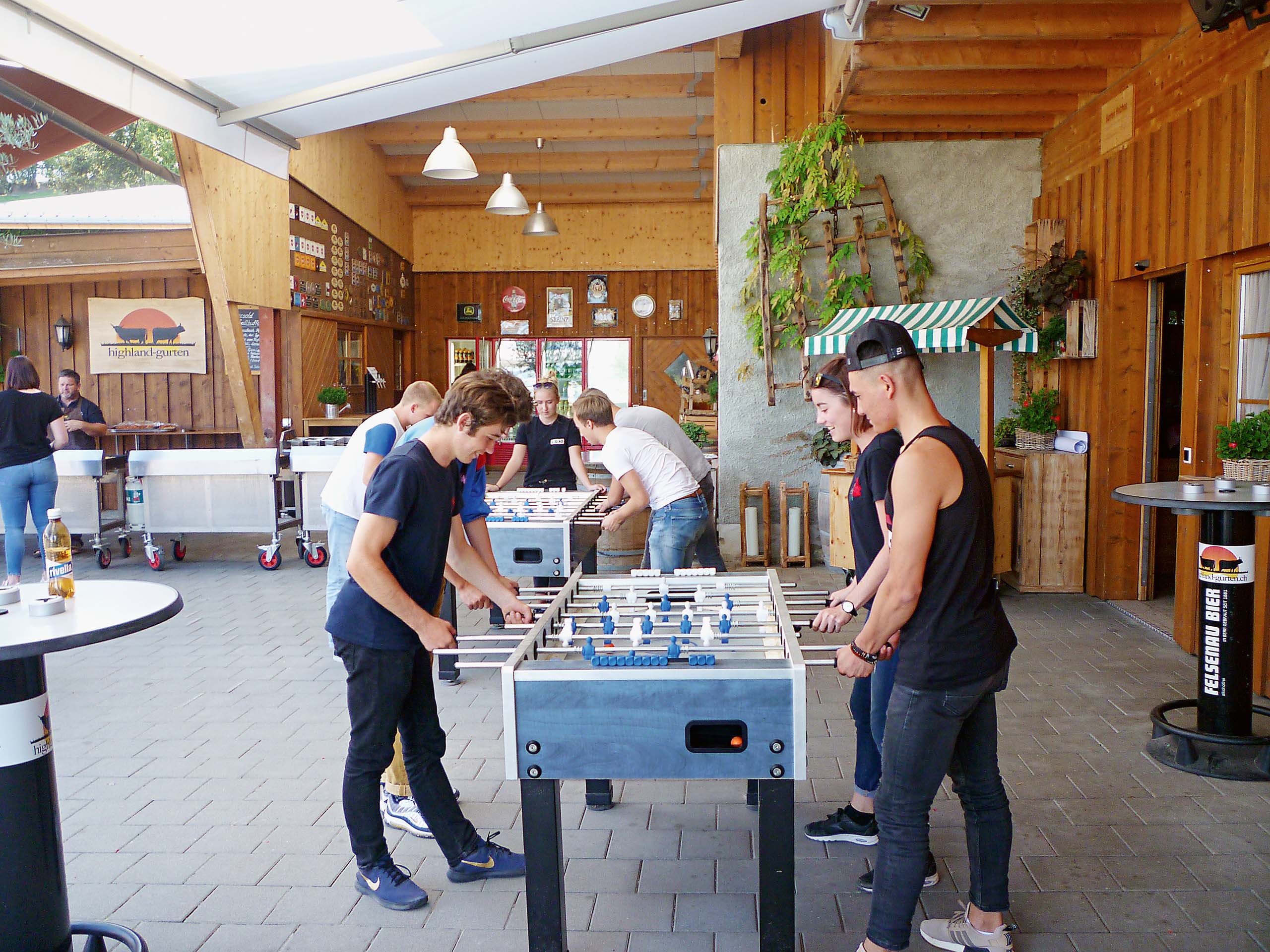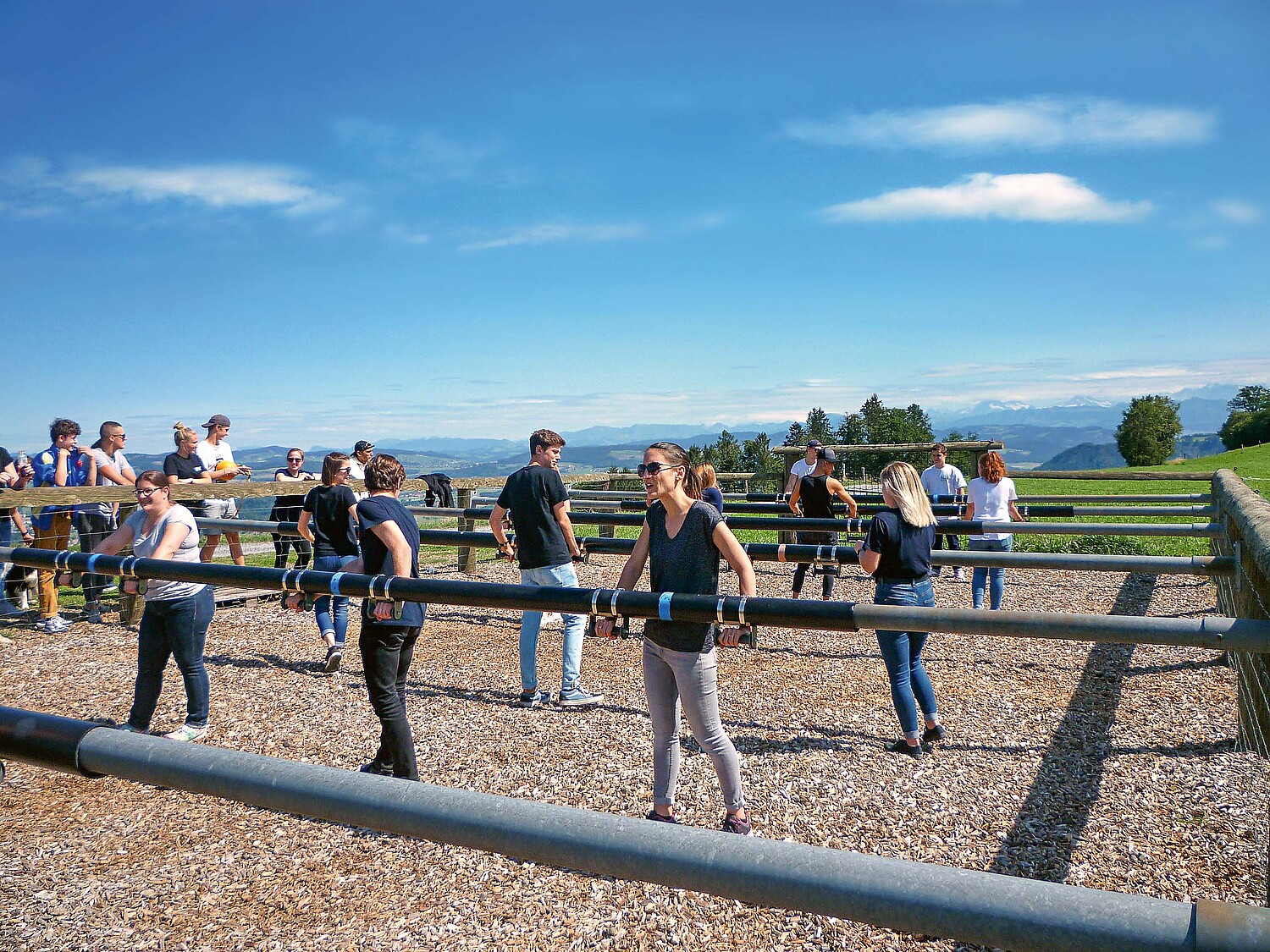 Nach diesem aktiven Morgen trafen sich alle auf dem Gurten. Sobald alle Gruppen da waren, ging es an die Rangverkündigung. Als Allererstes musste jede Gruppe den Organisatoren ihr bestes Bild schicken. Danach wurde eine Rangliste der Bilder erstellt. Letztlich ging es aber darum, wer am schnellsten alle Orte gefunden hatte und danach am schnellsten auf dem Gurten ankam. Für die ersten drei Gruppen gab es tolle Preise. Nun hatte jeder Zeit, sein mitgebrachtes Essen zu geniessen. Nach der Mittagspause gingen wir zu einem Bauernhaus, das nur etwa zehn Minuten entfernt war. Dort ging es dann aufs Neue so richtig los. Wieder in Gruppen verbrachten wir den ganzen Nachmittag mit Spielen, die vorbereitet worden waren. «Activity» und der menschliche «Töggelichaschte» standen zur Auswahl. Das Spiel «Activity» spielt man mit zwei Gruppen. Beim menschlichen «Töggelichaschte» spielen zwei Teams gegeneinander Fussball, wobei sich die Spieler an einer Stange festhalten müssen und so viele Tore wie möglich schiessen sollen. Trotz dem sportlichen Morgen beteiligten sich wieder alle aktiv. Die Belohnung war ein feines Abendessen im Bauernhaus, das die Gastgeber mit viel Liebe für uns gekocht hatten. Beim Buffet war für jedermann etwas Leckeres dabei. Nach dem langen und spassigen Tag machten sich die meisten zwischen 18 und 19 Uhr auf den Heimweg. Für mich war es ein sehr unterhaltsamer und erfolgreicher Tag, mit fantastischem Wetter und guter Stimmung. Ich freue mich schon auf den nächsten Ausflug.