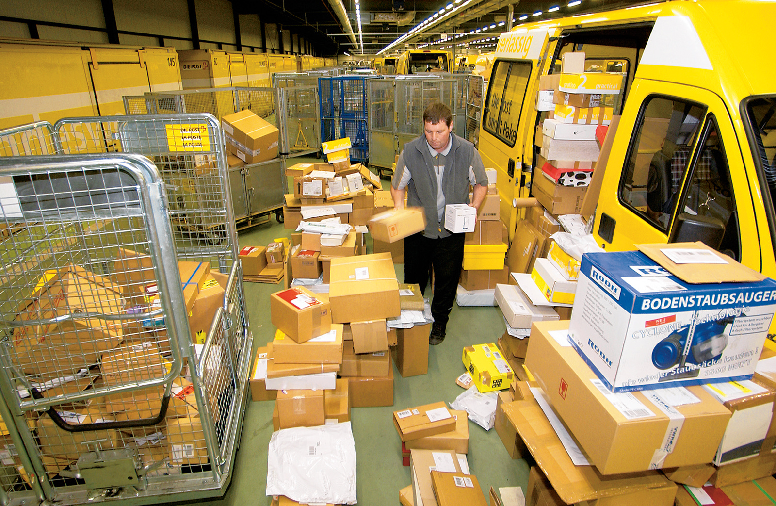 Charles Furrer, der Leiter des Zentrums, bringt Leben in die Situation, indem er uns den Betrieb schildert, der hier morgens in der Früh herrscht, wenn der erste von drei Zügen pro Tag aus Daillens vor 5 Uhr eintrifft, nachdem die Art der Bestückung der einzelnen Wagen bereits im Voraus über Mail bekannt gegeben worden ist. 54 Paketboten fahren mit ihren Kleinbussen zur bestimmten Zeit an den vorgesehenen Platz in der Halle, behändigen die für sie vorgesehenen Rollcontainer und beladen ihre Fahrzeuge mit einer Systematik, die sich auf der Tour bei den Postkunden bewährt. Sie bedienen die Haushalte der gesamten Stadt Bern samt Regionsgemeinden von Jegenstorf bis Münsingen und von Hinterkappelen bis Worb. An den Andockstellen nehmen Lastwagen die Pakete für weiter entlegene Poststellen wie etwa Schwarzenburg, Büren a.d.A. oder Sumiswald entgegen – jedem sind zehn Minuten Zeit eingeräumt, dann hat er gemäss Fahrplan dem nächsten Platz zu machen.