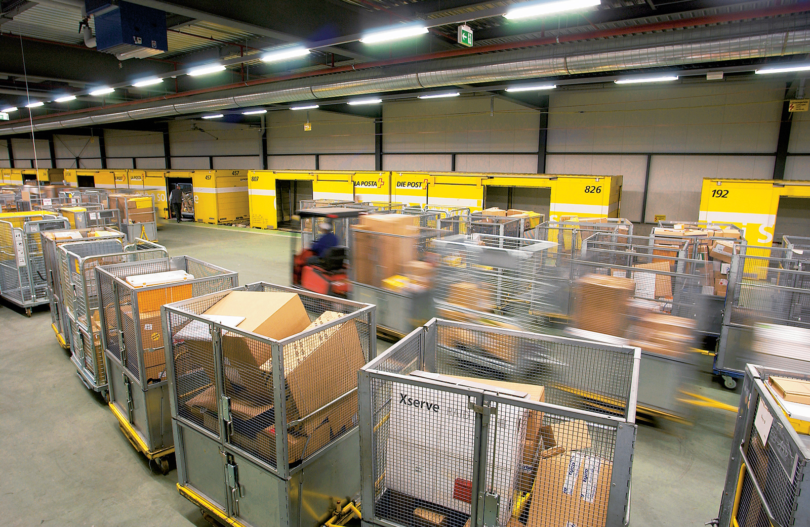 zu einem Besichtigungstermin antritt, ist auf Anhieb erstaunt über die Ruhe, die rund ums Gebäude und in seinem Innern herrscht. Das Auffälligste in der 200 Meter langen Halle, dem Herzstück der Anlage, sind die elf gelben Bahnwagen – intern liebevoll Banane genannt –, welche die eine Längsseite des Raums einnehmen. Auf der Seite gegenüber finden sich verschiedene Zufahrtsrampen und Andockstellen, und auf der Fläche dazwischen beherrschen Bodenmarkierungen, aufgehängte Nummernschilder und Rollcontainer das Bild.