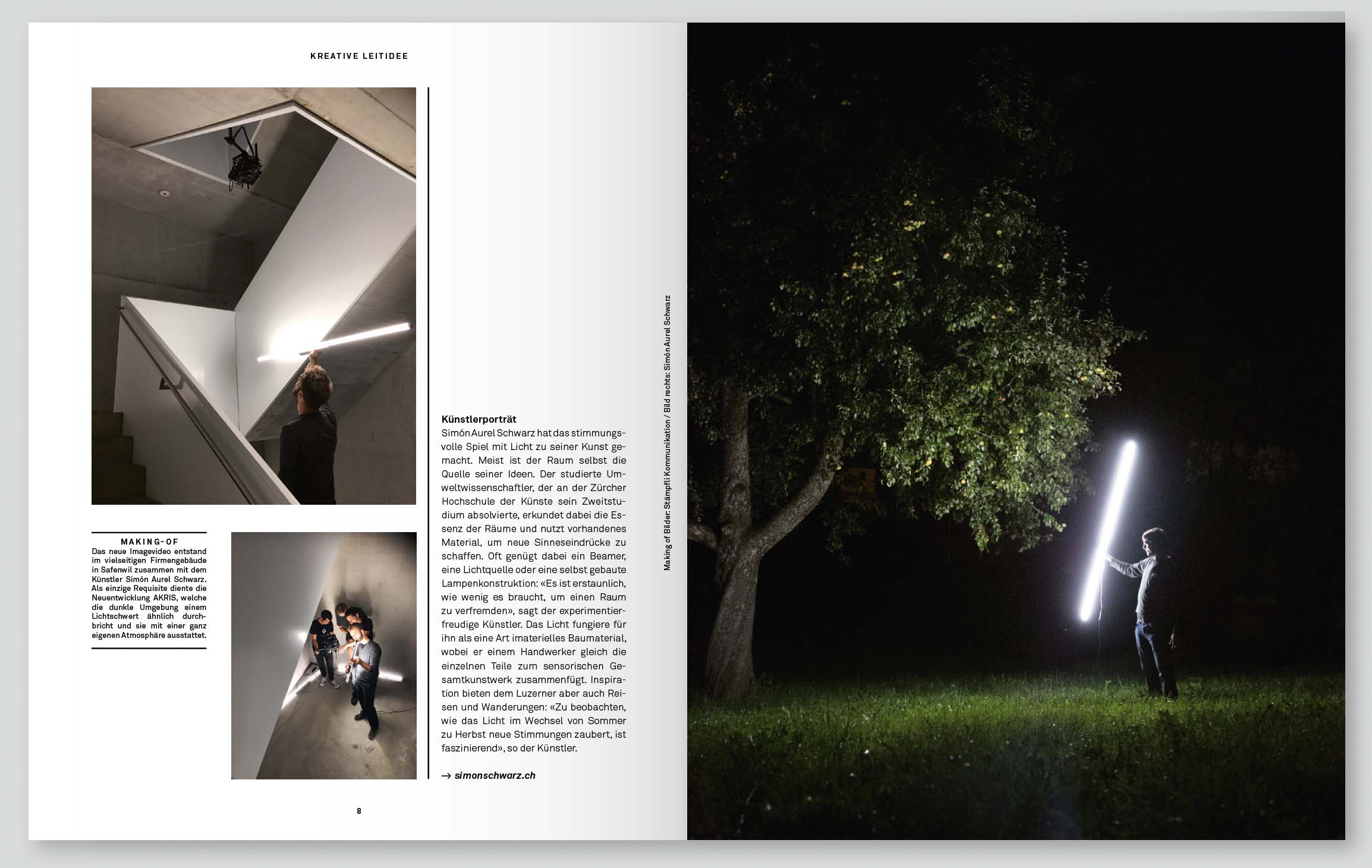 Das neue Imagevideo entstand im vielseitigen Firmengebäude in Safenwil zusammen mit dem Künstler Simón Aurel Schwarz. Als einzige Requisite diente die Neuentwicklung AROA, die die dunkle Umgebung einem Lichtschwert ähnlich durchbricht und sie mit einer ganz eigenen Atmosphäre ausstattet. Die Videoproduktion erfolgte durch Thai Christen, in Begleitung durch Stämpfli Kommunikation.