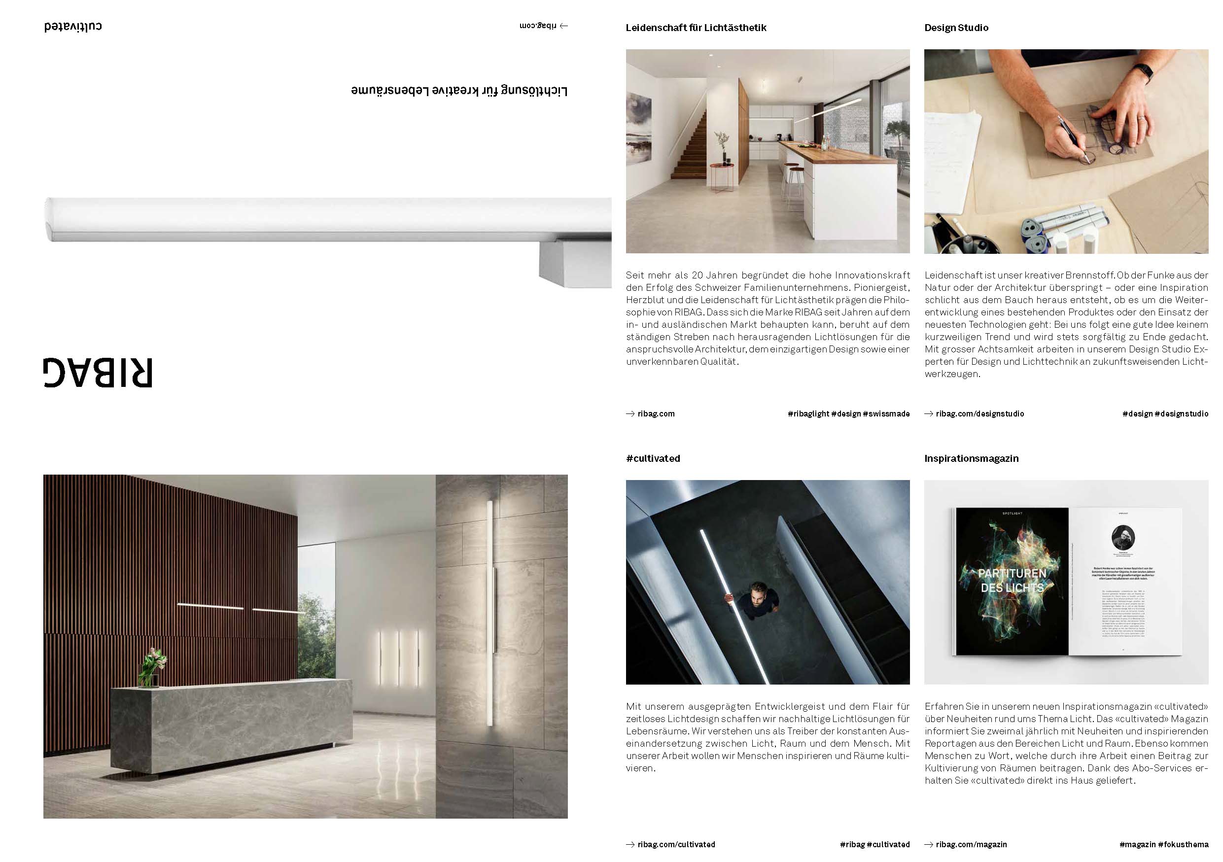 RIBAG inspiriert Menschen und kultiviert Räume. Und dafür steht der neue Markenauftritt des Leuchtenherstellers: «cultivated» ist der neue Claim, der den neuen Blick auf Licht und dessen emotionale Kraft verdeutlicht. Stämpfli Kommunikation erstellte für diesen neuen Markenauftritt das Gesamtkonzept. Dessen elementare Bestandteile sind die Komponenten Licht, Raum und Mensch, die wechselseitig aufeinander einwirken und inspirieren.