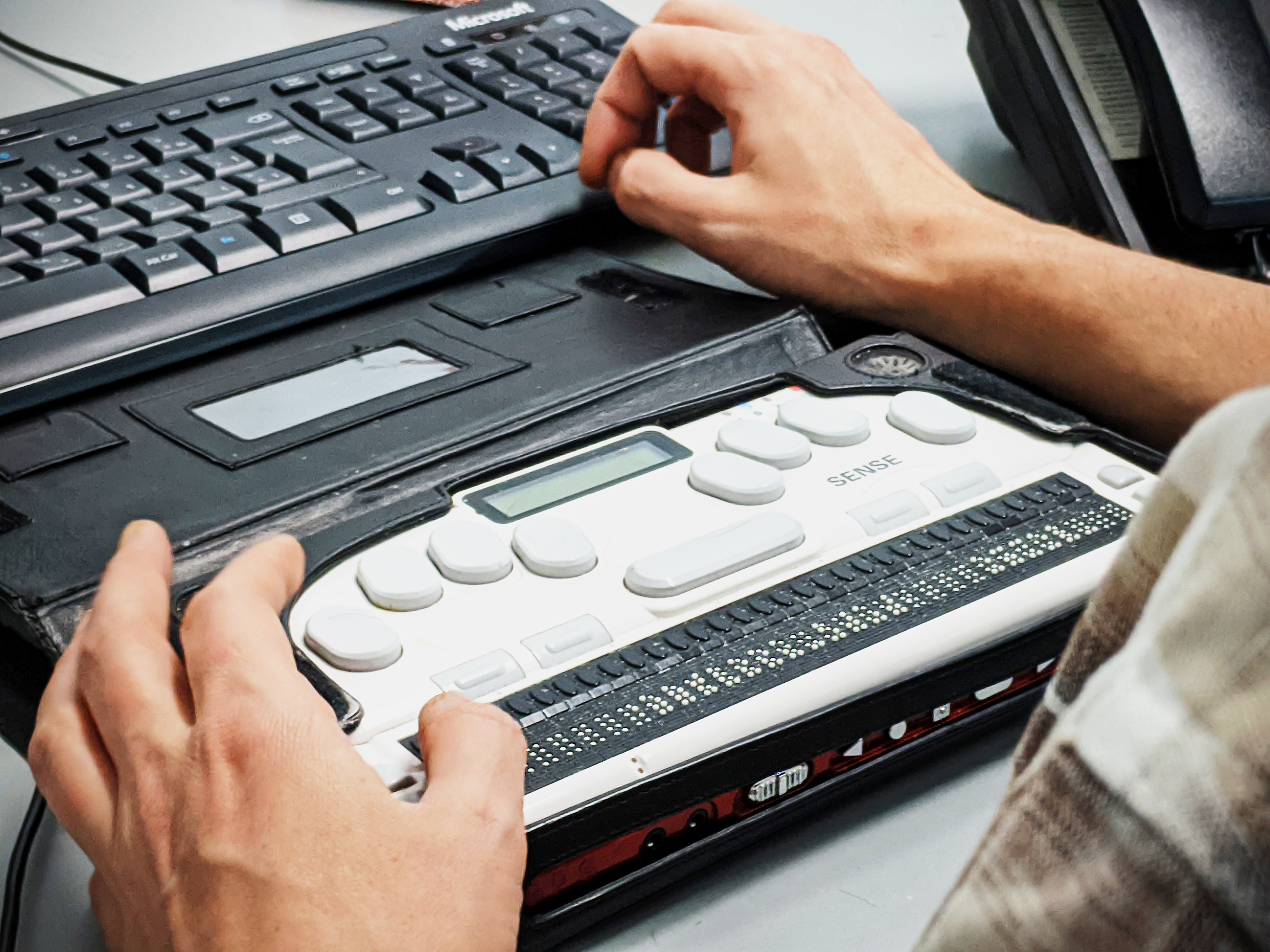 Zum Schreiben bedienen sich Blinde der Punktschriftmaschine. Dabei werden die sechs Punkte in einer Reihe angeordnet, und für jeden Buchstaben müssen die entsprechenden Punkte gleichzeitig gedrückt werden. Zudem lassen sich Computer mit einer sogenannten Braillezeile unterhalb der Tastatur ausrüsten. In diese Zeile sind kleine bewegliche Stifte eingelassen, die Bildschirminhalte in Brailleschrift darstellen können.
