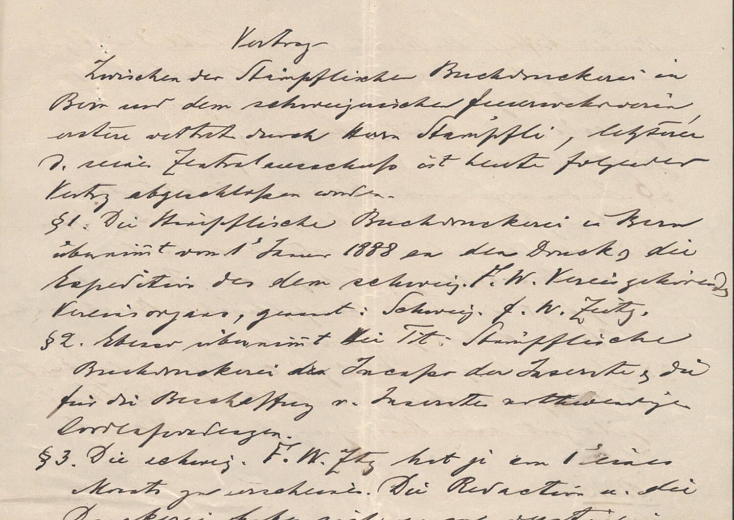 Feuerwehroffizier Fritz Studer-Leuzinger war der Schwager und Associé des damaligen Besitzers der Firma, Karl Stämpfli. Deshalb ist nicht verwunderlich, dass am 28. Juli 1888, einige Monate nach seiner Ernennung zum Redaktor, ein weiterer Vertrag zwischen dem «Centralausschuss» und der «Stämpfli’schen Buchdruckerei» zustande gekommen ist, aus dem hervorgeht, dass das Unternehmen schon seit Jahresbeginn für den Druck und die «Expedition» der Feuerwehrzeitung mit einer Auflage von 1500 Exemplaren sowie für das «Incasso & die für die Beschaffung v. Inseraten nothwendigen Correspondenzen» verantwortlich war. Stämpfli erhielt für die zwölf Nummern eines Jahres für «Satz, Druck, Papier, Spedition & Frankatur» 1260 Franken und für die Arbeit mit den Inseraten fünf Prozent der «daherigen Einnahme», durfte jedoch «artistische Beilagen, Pläne, oder Clichés» separat berechnen.